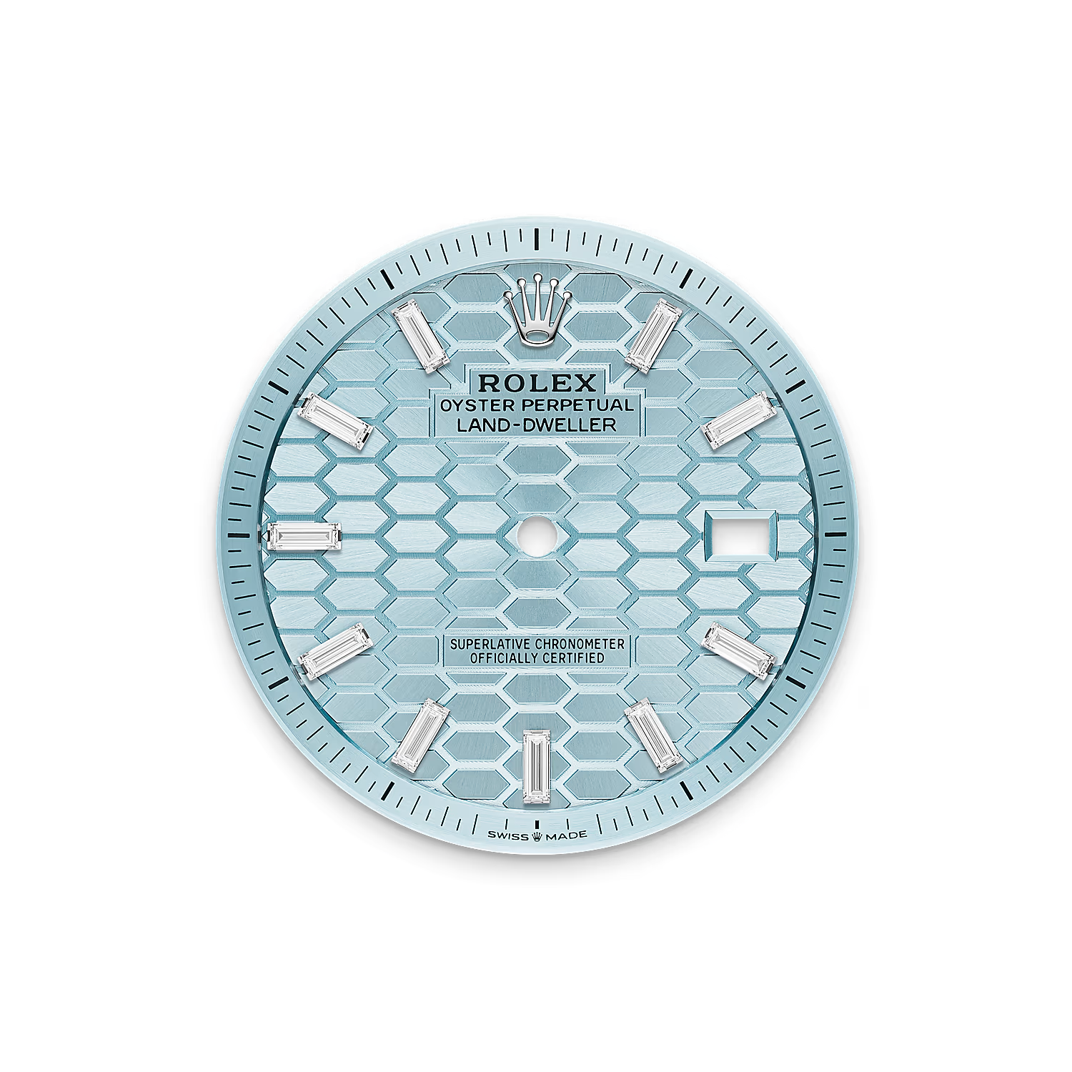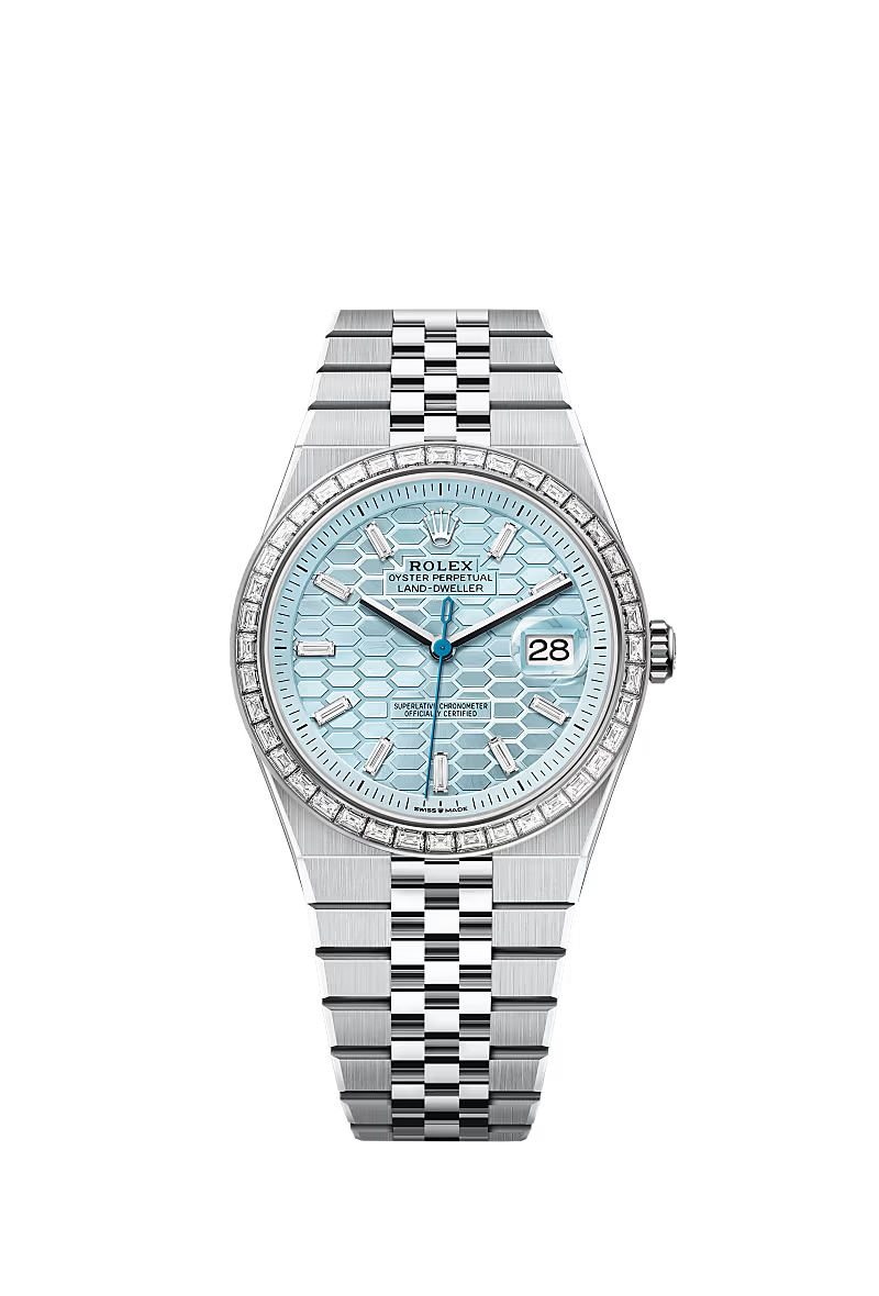 ساعة لاند دويلَر ٤٠ من البلاتين المجهّزة بمينا أزرق فاهٍ بنمط أقراص العسل مُرصّع بالألماس وسوار جوبيلي مسطّح.