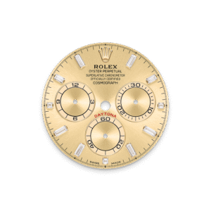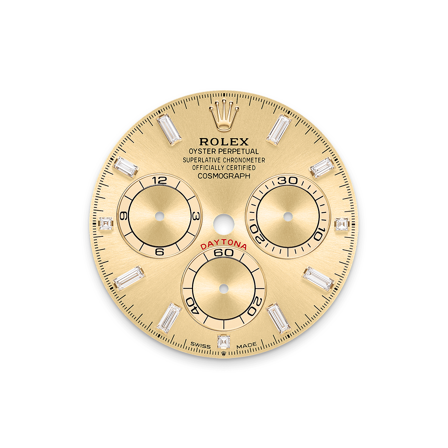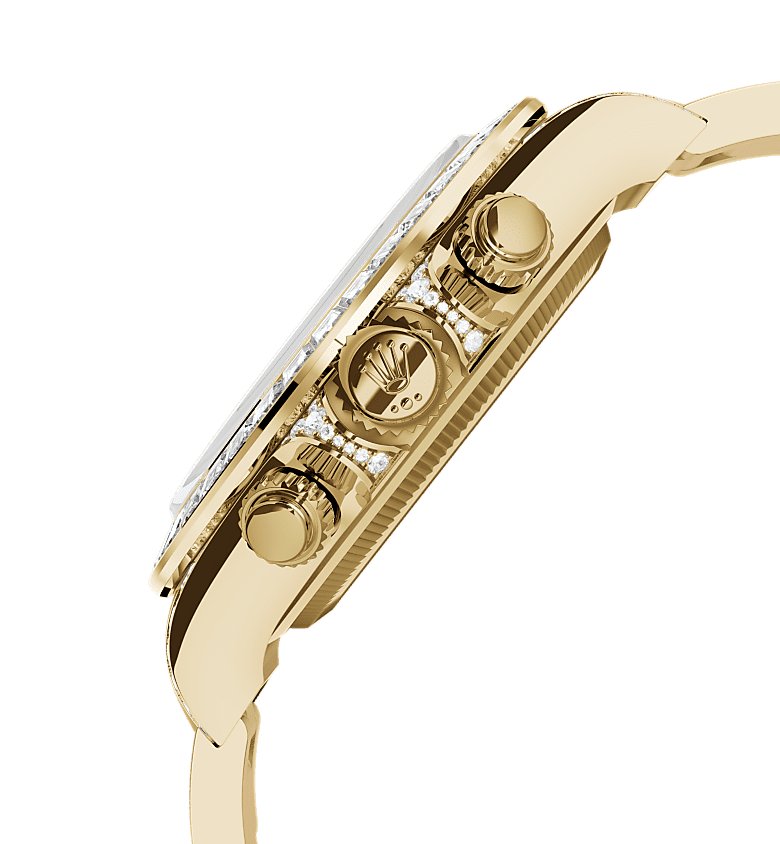 تتميز ساعة أويستر بربتشوال كوزموغراف دايتونا المصنوعة من ذهب أصفر عيار ١٨ قيراطًا بمينا ذهبي، مُرصّع بالألماس وسوار أويستر وإطار مُرصّع بالألماس وقضبان مرصعة بالألماس.