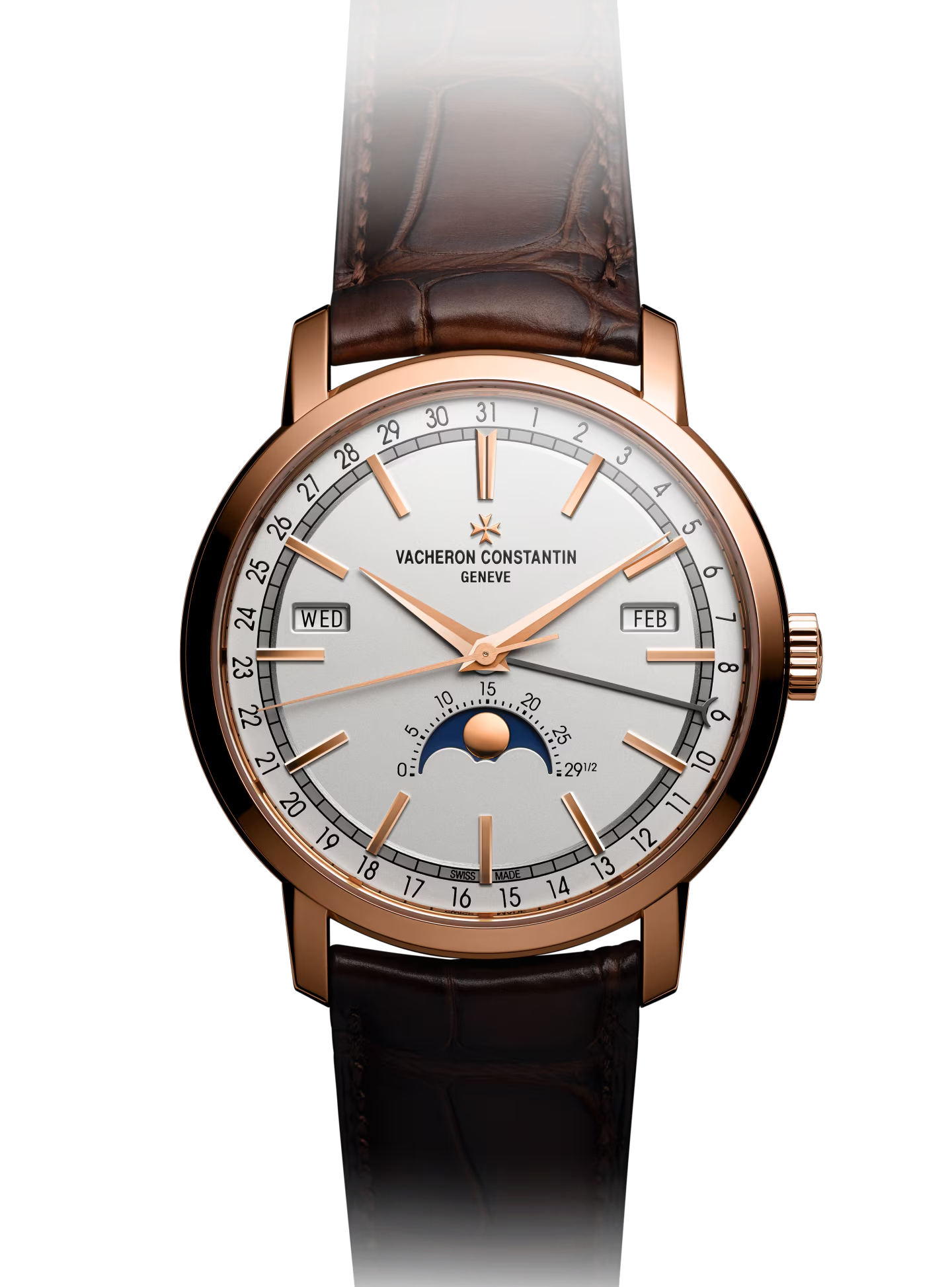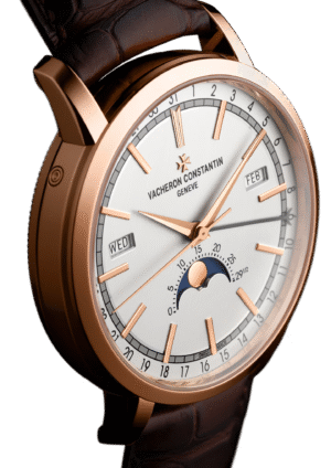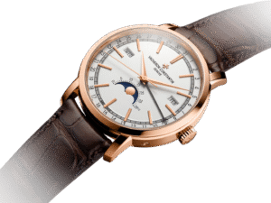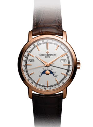ساعة Traditionnelle التقويم الكامل تستلهم إلهامها من التصميم الكلاسيكي، حيث تتميز بصندوق دائري متدرج وأذنيات صندوق مُخددّة، وغطاء خلفي مُجوّف، وحلقة دقائق على شكل سكة حديد، وعقارب على شكل دوفين (Dauphine)، متّبعةً عرض التقويم الأصلي والجديد لـفاشيرون كونستانتين.
