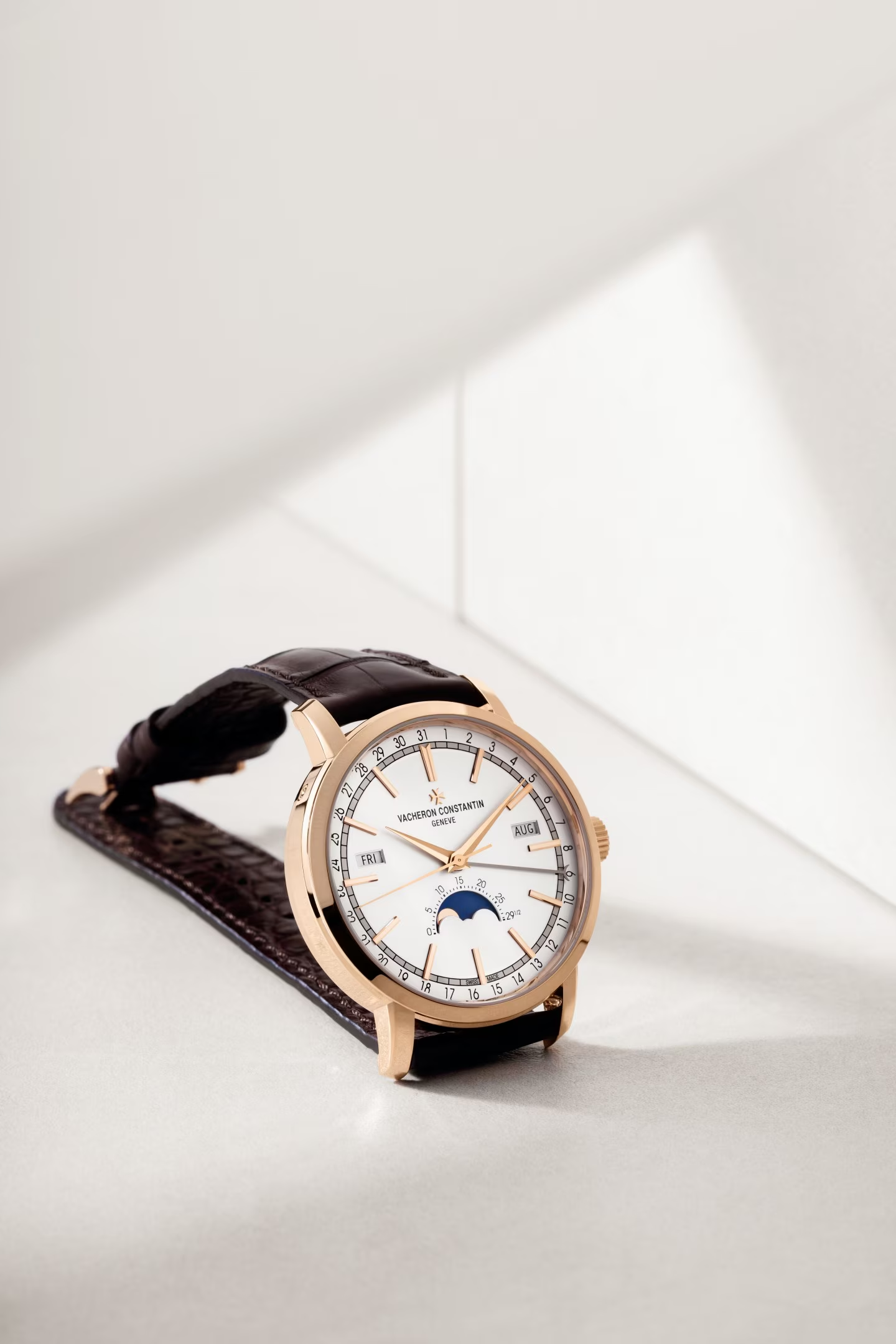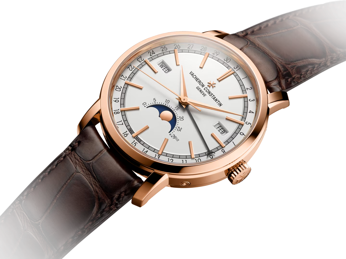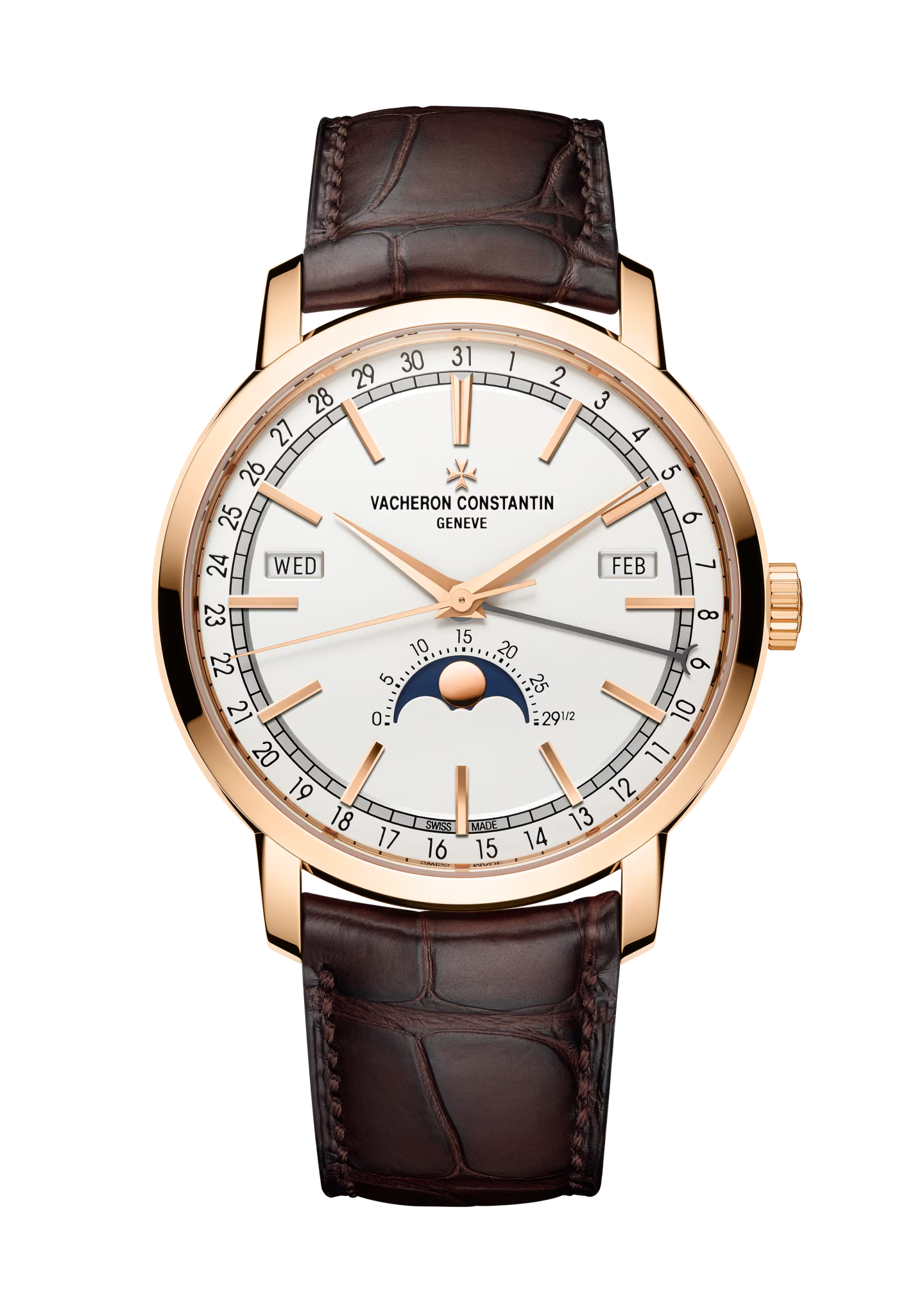 تنتظم نوافذ اليوم والشهر بتناظر على حافة القرص، بينما يُشار إلى التاريخ بواسطة عقرب مخصص. هذا التخطيط يجعل عرض طور القمر الدقيق عند موضع 6 ساعات أكثر لفتاً للانتباه.